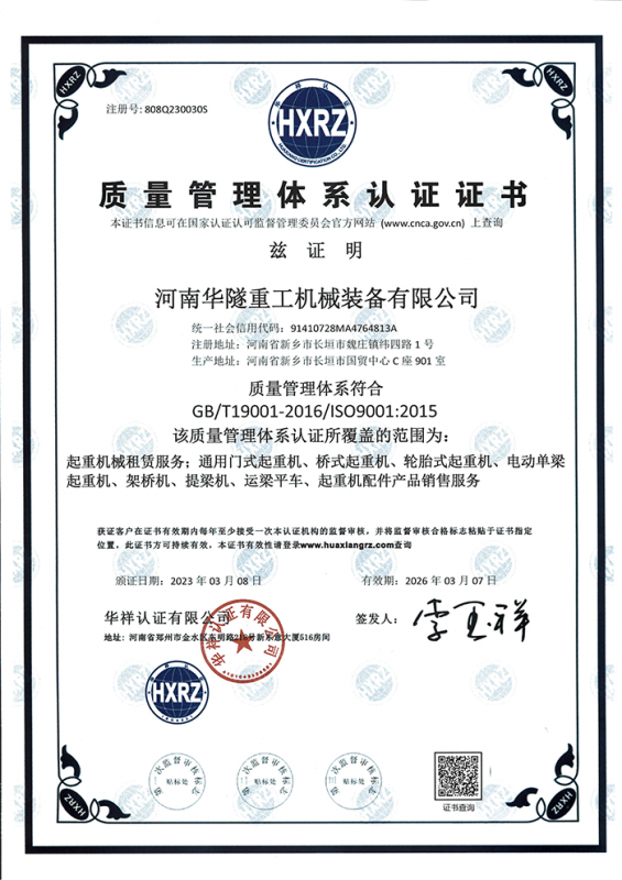 河南華隧重工機械裝備有限公司主要從事通用門式起重機、橋式起重機、電動單梁起重機,輪胎式起重機、架橋機、提梁機、遠梁平車、鋼絲繩電動萌蘆、卷揚機、起重配件制造、銷售:起重機械租賃、安裝和維修,起重設備園收,機械設備維修,鋼結構工程承包,橋梁工程及技術咨淘服務,銷售五金制品、機電設備:建設工程監理,建設工程設計,各類工程建設活動,建筑勞務分包,建筑物折除作業,施工作業,工程管理服務,土石方工程施工,裝如發運。  公司已通過IS0國際質量、環境、健康與安全三合一標準認證,特種設備制造許可證和特種設備安裝改造維修許可證。擁有完熟的質量管理體系。嚴格的管理制度,強大的生產能力和先進的檢測手段,在保證產品質量的同時,也具備了極強的市場競爭力。  公司堅持科技創新為理念,產品質量為核心,注重信譽,建立了減信可靠、快捷、思速。便利周到的售后服務網絡。  我們擁有的技術專家和技術服務隊伍為客戶提供充善的售前技術支持和全天候的售后服務體系,讓您無后顧之憂,享受一站式的超值服務。  “華隧重工,伴您成功“是華隧重工永遠的宗指,真被的希望與各界朋友攜手并進。共創輝準!